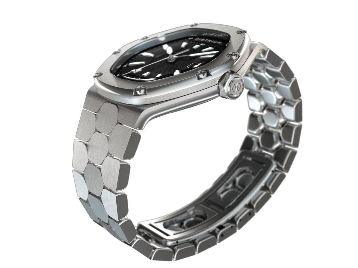Case: custom cut Sapphire glass with anti-glare coating both sides, screwed crown. Case, bezel, back, screws and bracelet in 316L stainless steel, brushed and polished. Hands and indexes stainless steel color, mirror polished